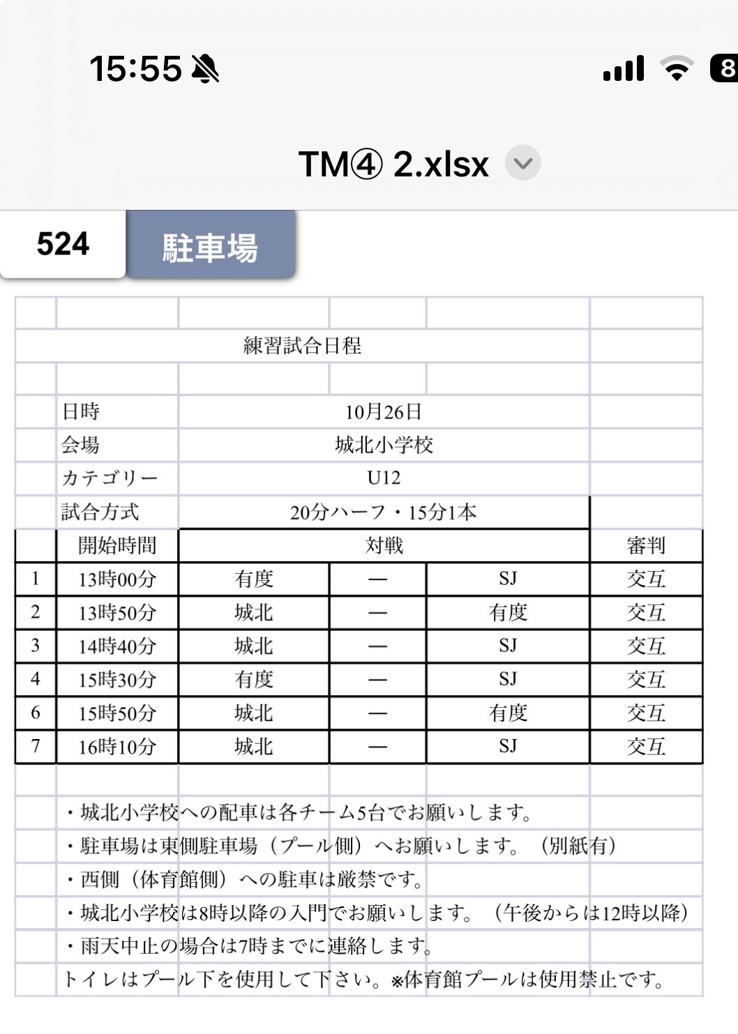 【6年生】10月26日(日)練習試合 投稿日 2025年10月20日 著者 udo-fc カテゴリー インフォメーション カテゴリー 六年生 会場>静岡城北小学校 集合>11:30(有度一正門P) 解散>16:45頃 ********** 以下の返信を10月23日(木)15:00までにjimukyoku@udofc.comへ返信願います。 ********** 選手氏名 出欠(可・不可) 配車(可・不可) ①配車可の場合は以下のついても回答をお願いいたします。 ・乗車可能人数( )名 ・配車にならなかった場合 ❶同乗希望 ➋いかない