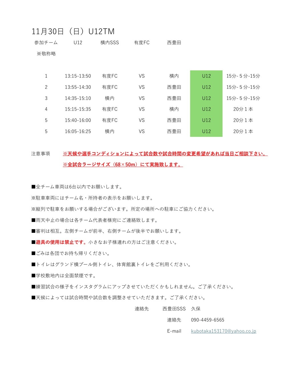 【6年生】11月30日(日)練習試合 投稿日 2025年11月25日 著者 udo-fc カテゴリー インフォメーション カテゴリー 六年生 会場>西豊田小 集合>12:00(有度一正門P) 解散>16:30頃 ********** 以下の返信を11月27日(木)15:00までにjimukyoku@udofc.comへ返信願います。 ********** 選手氏名 出欠(可・不可) 配車(可・不可) ①配車可の場合は以下のついても回答をお願いいたします。 ・乗車可能人数( )名 ・配車にならなかった場合 ❶同乗希望 ➋いかない