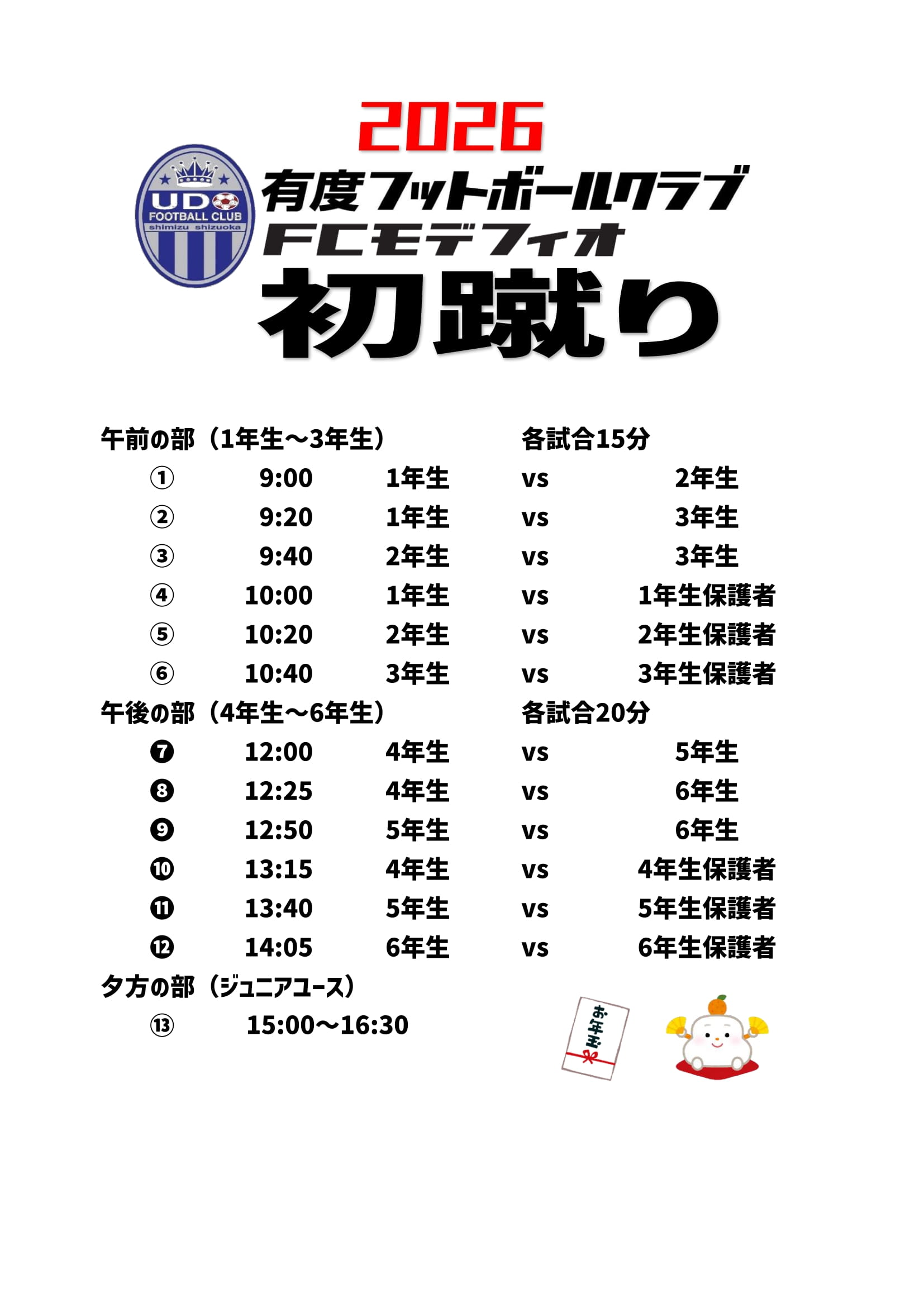 2026年1月3日(土)初蹴り 投稿日 2025年12月3日 更新日 2025年12月12日 著者 udo-fc カテゴリー インフォメーション カテゴリー 一年生 カテゴリー 二年生 カテゴリー 三年生 カテゴリー 四年生 カテゴリー 五年生 カテゴリー 六年生 カテゴリー ジュニアユース 会場>有度一小 「クラブOBは、ジュニアユースの時間に」