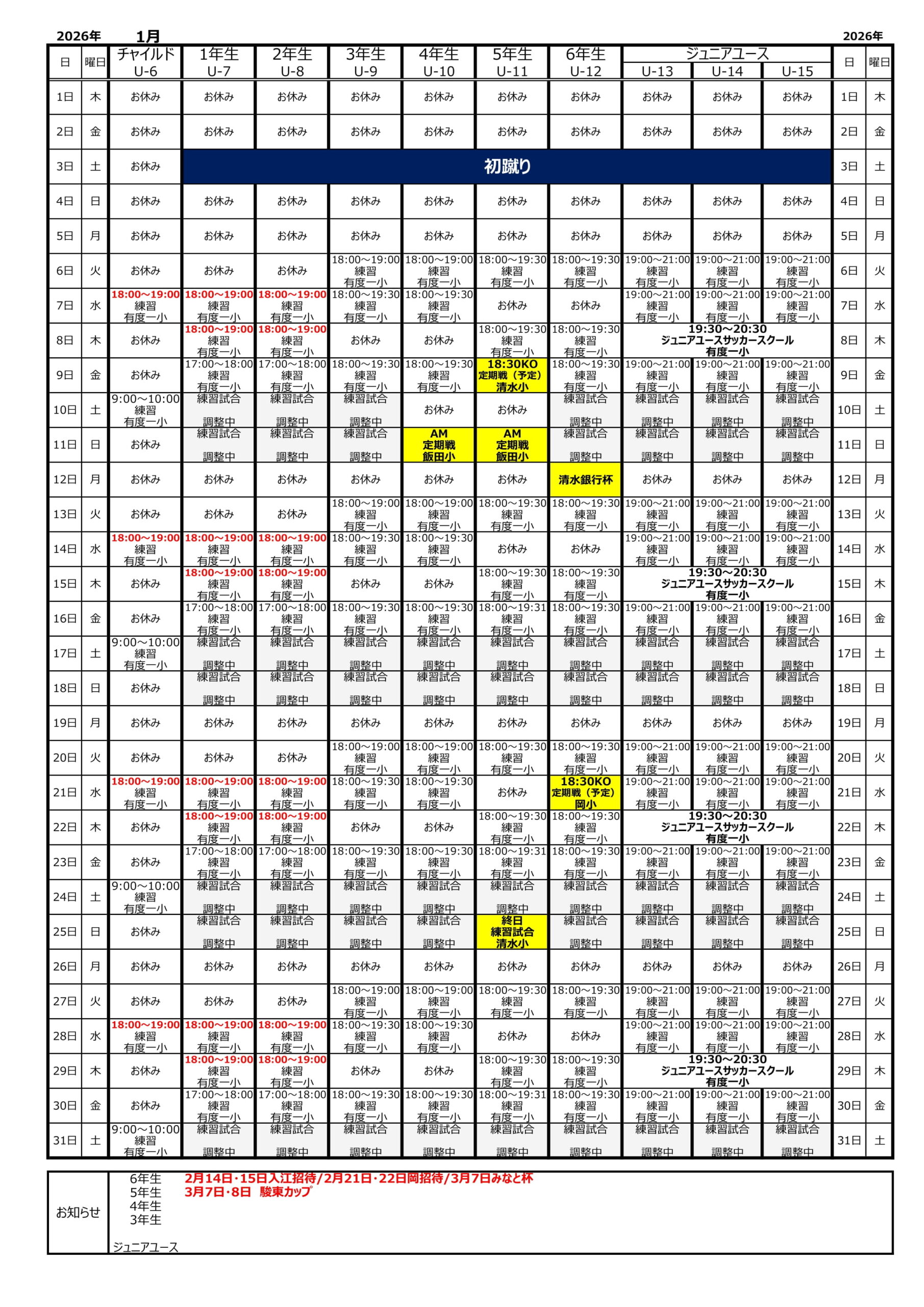2026年1月 予定スケジュール 投稿日 2025年12月8日 更新日 2025年12月11日 著者 udo-fc カテゴリー カレンダー 2026年1月よりチャイルド・1・2年生の練習時間が変わります
