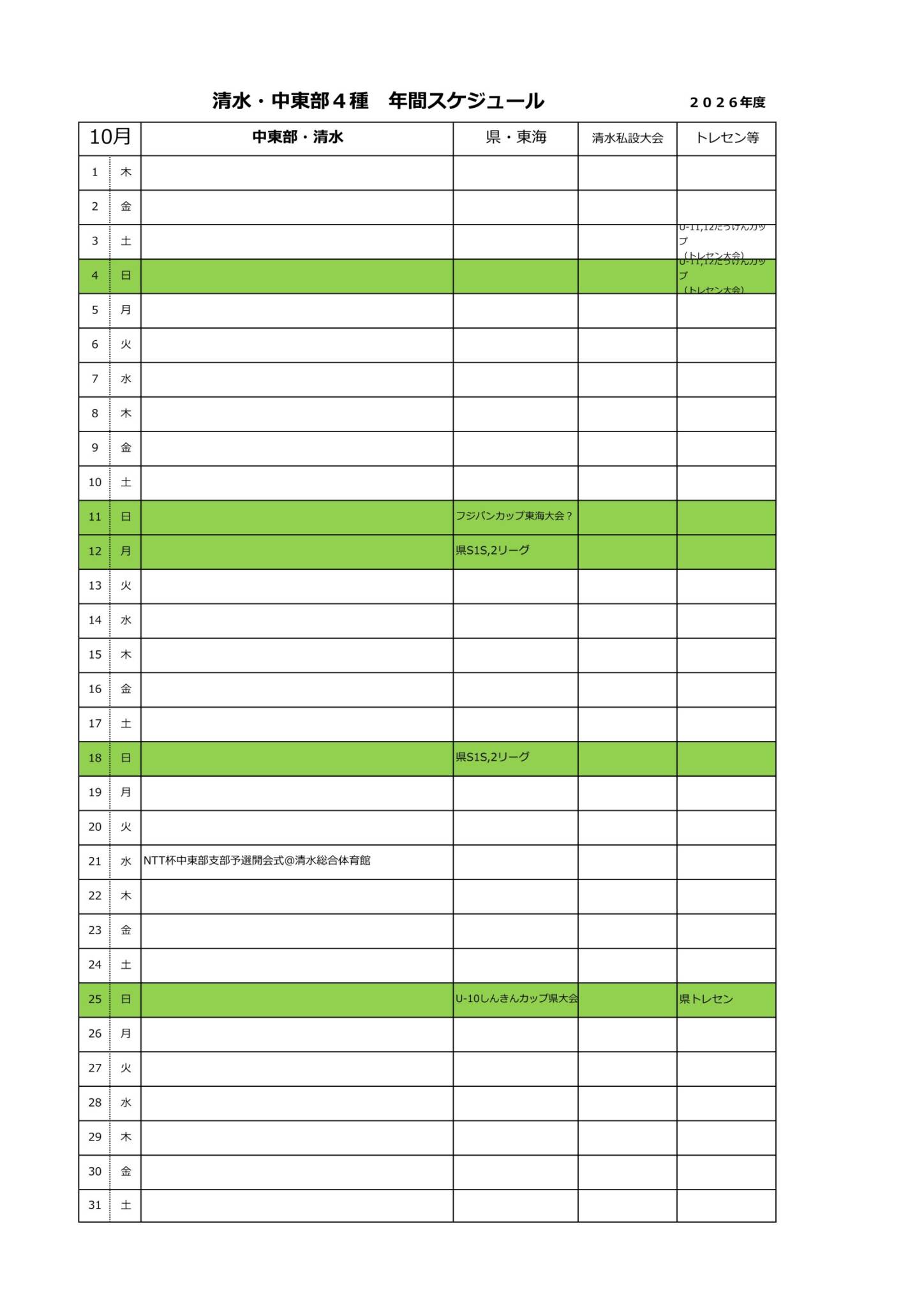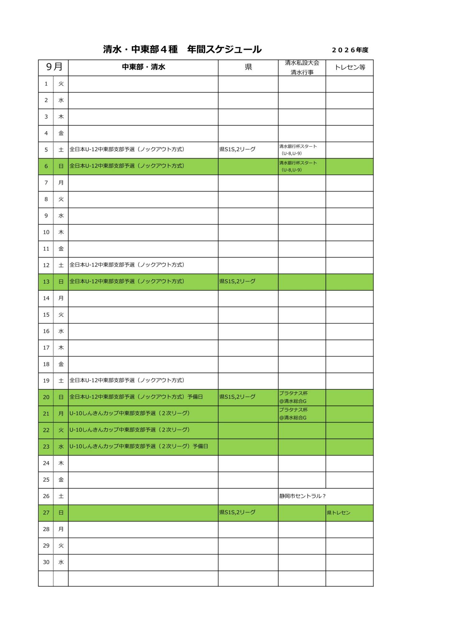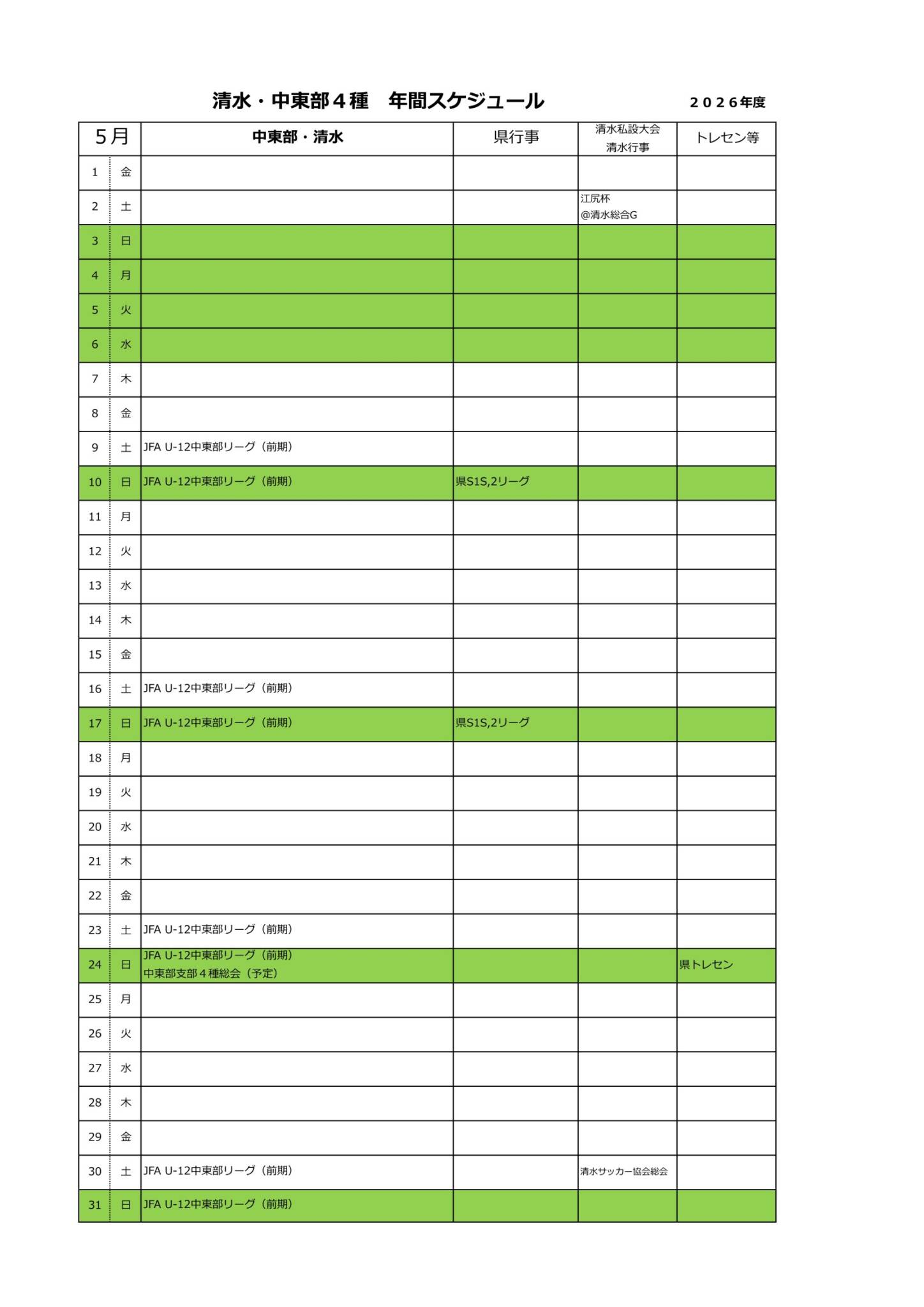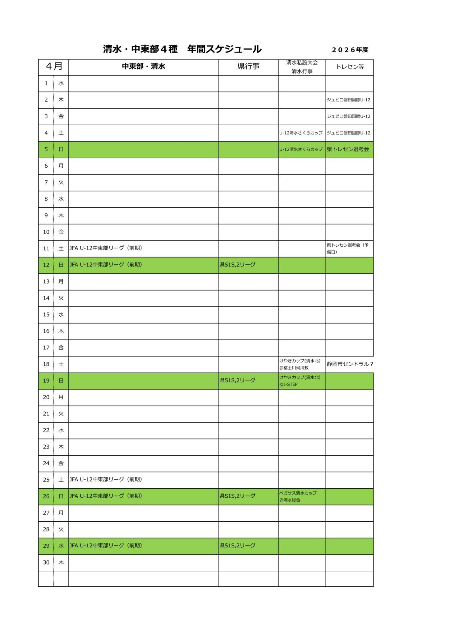 2026年度清水・中東部4種スケジュール(予定)
