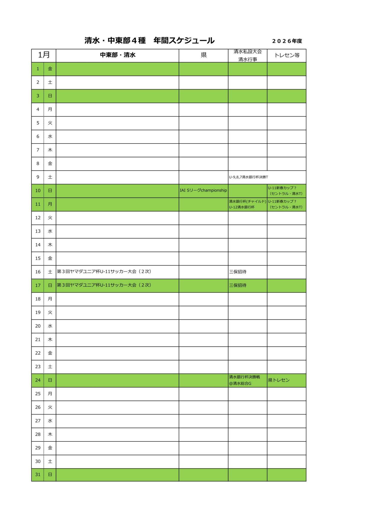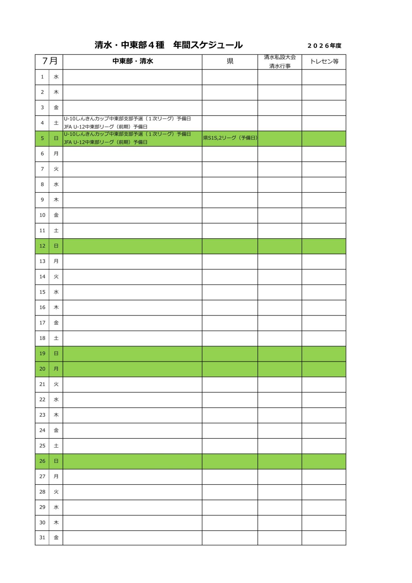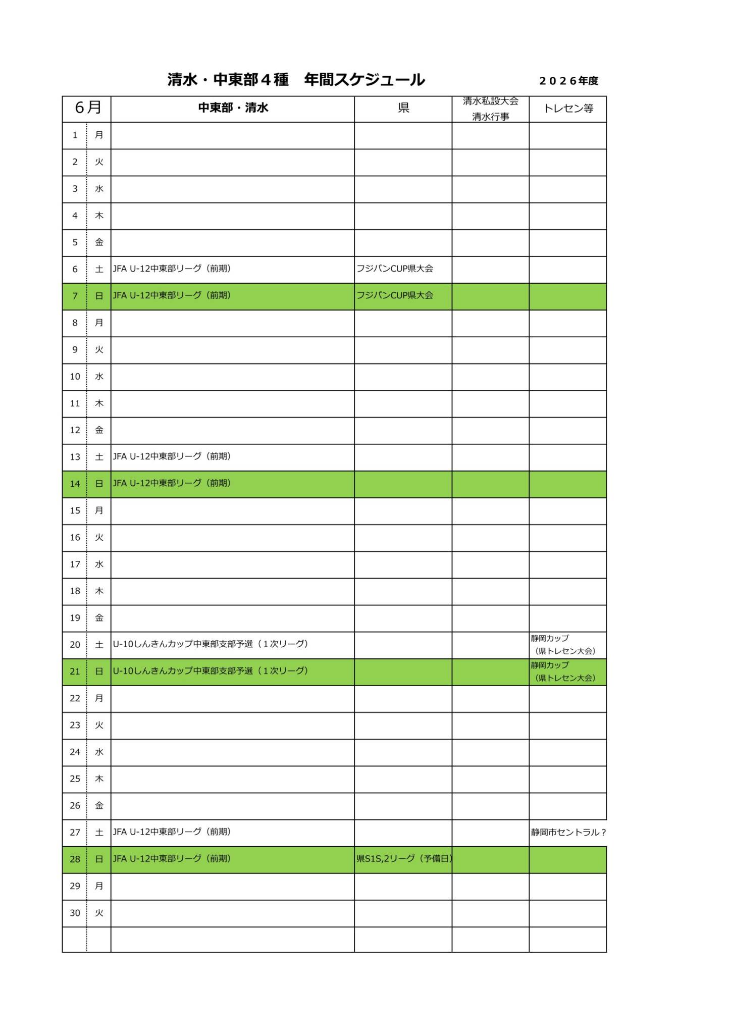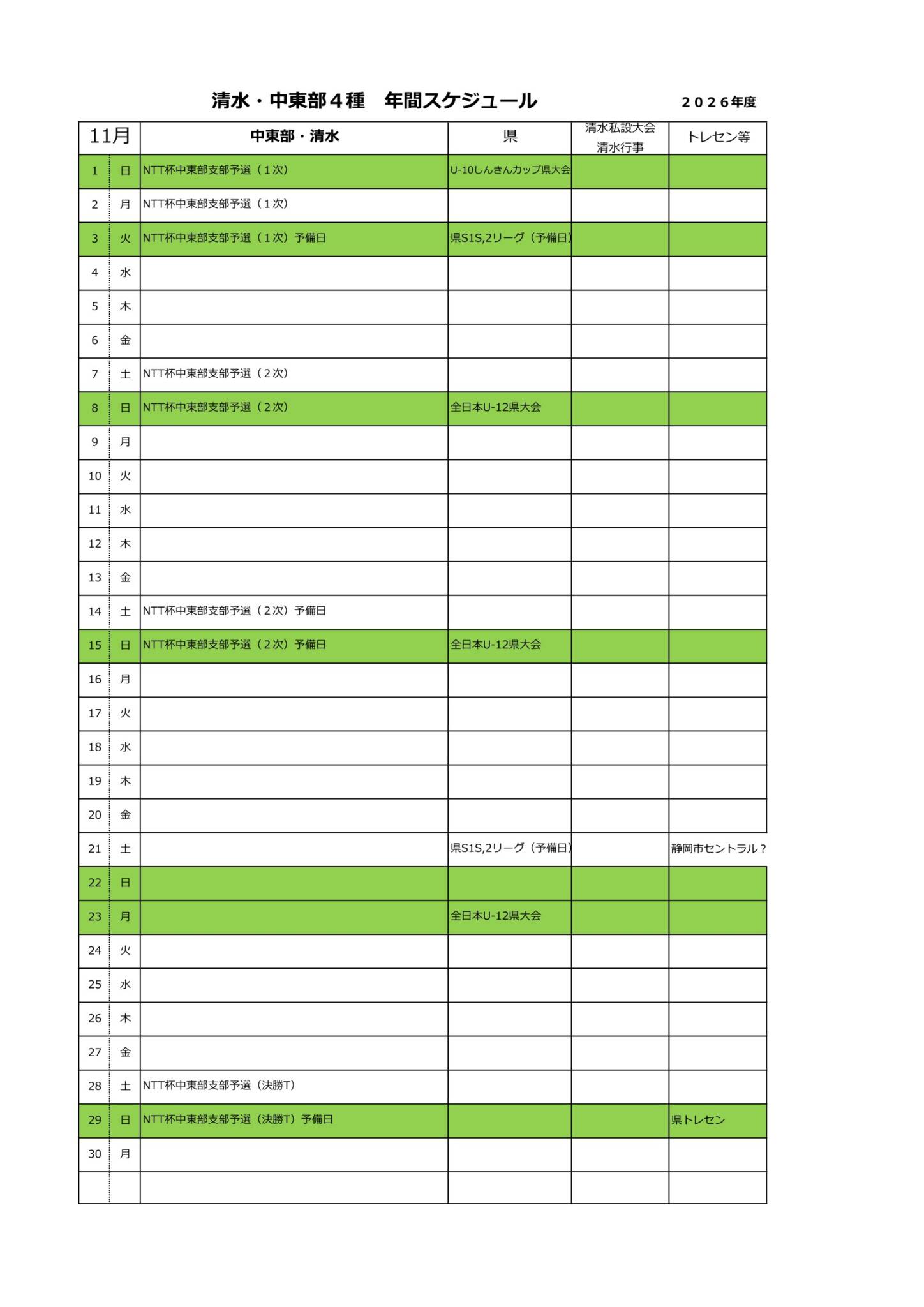 2026年度清水・中東部4種スケジュール(予定)